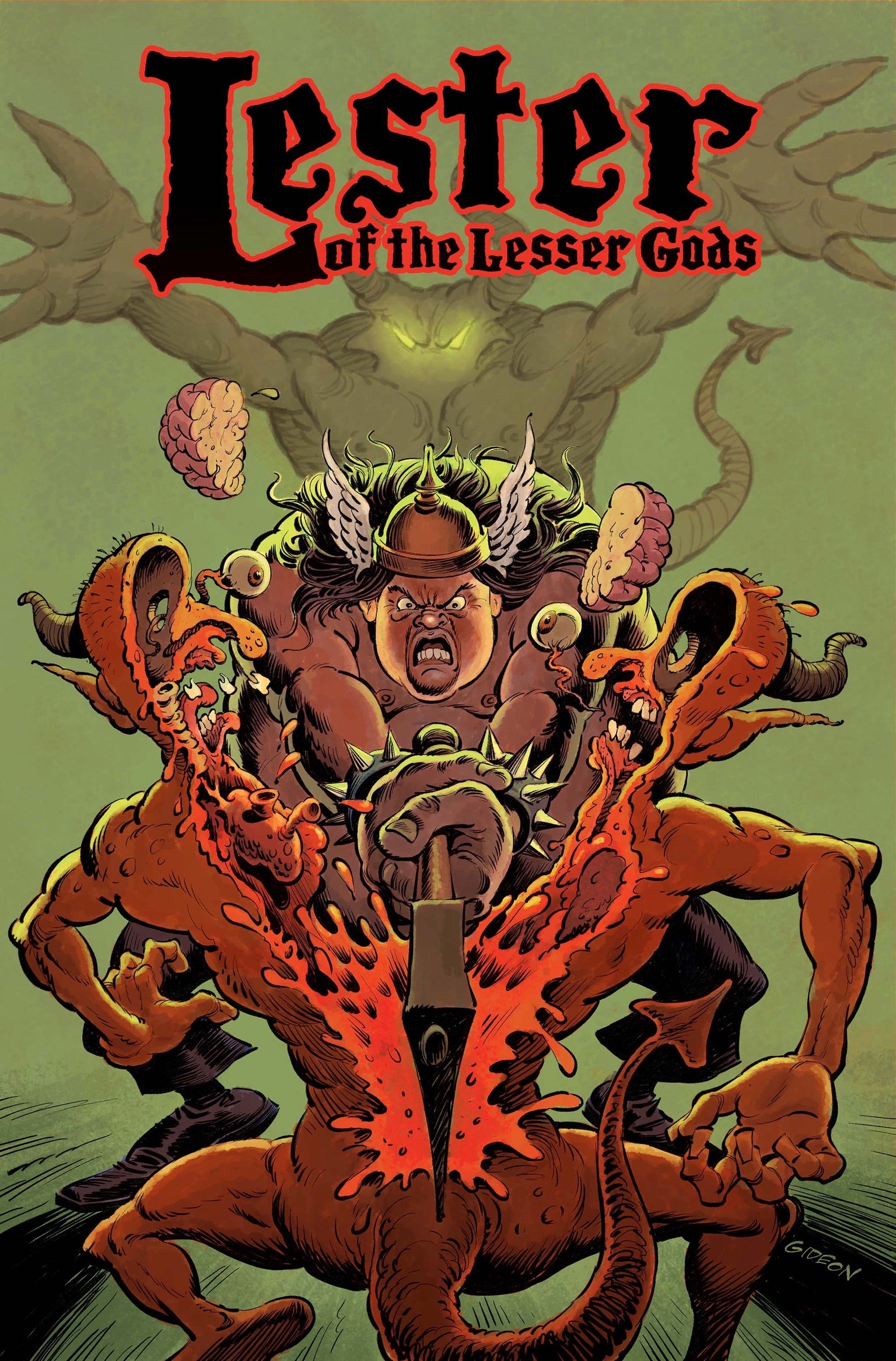 From Eric Powell (The Goon), Lucky Yates (Comedian and voice of Dr. Krieger from Archer), Mac Cushing (Spook House) and Eisner Award-winning artist Gideon Kendall (Megaghost) comes LESTER OF THE LESSER GODS! Lester has no friends and no life. That is until Satan unleashes the Apocalypse! No longer is he a 32-year-old, 300 pound LARPer who lives with his mother. A mother who constantly re-minds him of his lowly conception in a biker bar bathroom. But momma didn't get that gimpy hip from knocking boots with any old biker... t'was a GOD! And Satan shall suckle his knuckle! HUZZAH!